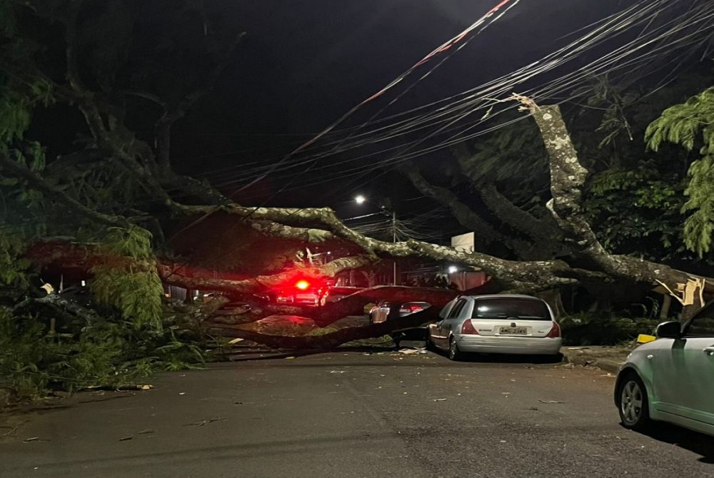 Uma forte ventania registrada na noite desta quarta-feira (19), por volta das 19h30, provocou a queda de árvores e galhos em diferentes pontos da área urbana do município. Apesar da intensidade das rajadas, não houve registro de chuva durante o temporal.
