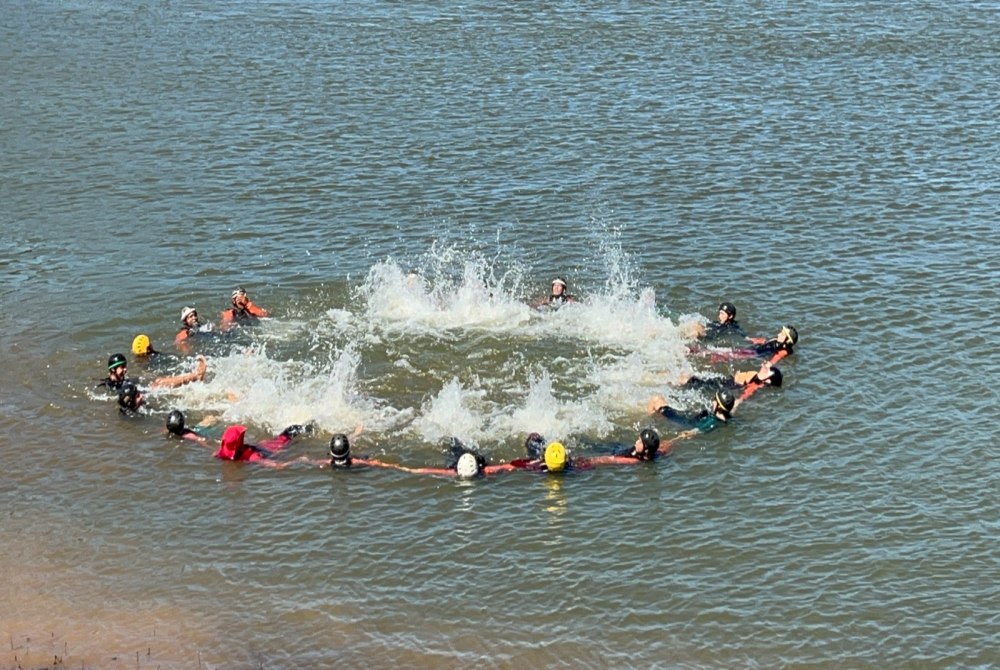 O treinamento prático incluiu dinâmicas para facilitar o salvamento aquático, como sustentação em águas agitadas, deslocamento em grupos em caso de naufrágio e sinalização para casos de resgate aéreo - ensinando como pessoas à deriva podem fazer uma roda e formarem a chamada “estrela da vida” na superfície da água.