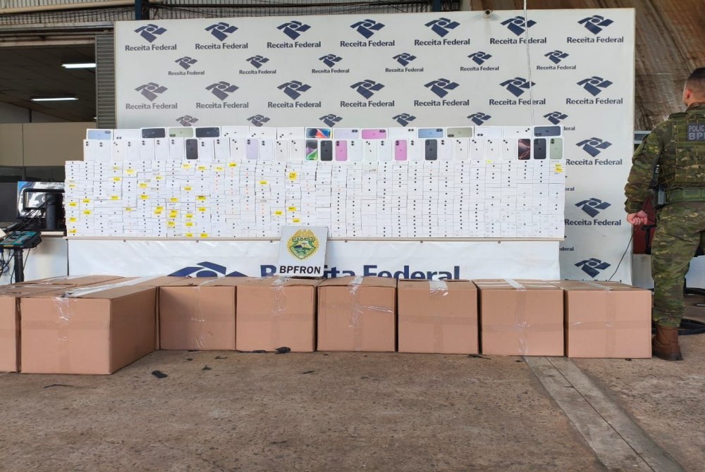 Após ser abordado, o motorista apresentou informações contraditórias e comportamento suspeito. Durante a fiscalização veicular, foram localizadas caixas contendo aparelhos celulares da marca iPhone sem o devido desembaraço aduaneiro.