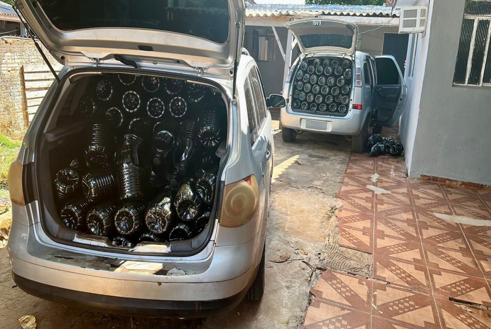 Os galões, com capacidade de 5 litros cada, estavam sem rotulagem e foram encontrados no interior de dois veículos, em uma residência utilizada como depósito de produtos irregulares provenientes da Argentina.