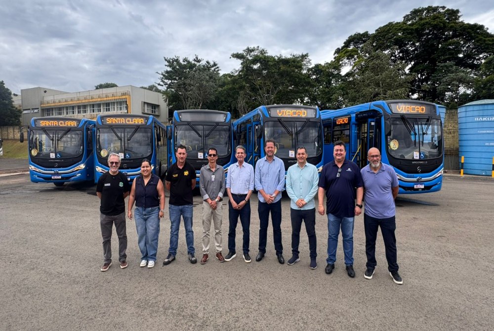 A Viação Santa Clara (VISAC) realizou, na manhã desta segunda-feira (23), a entrega de cinco ônibus 0 km equipados com ar-condicionado para o Foztrans- Instituto de Trânsito, fortalecendo o processo de modernização do transporte coletivo do município.